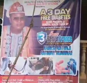 The entire people of Agbado community in Ifo local Government, Ogun state, were full of appreciation to the family of late Oba Anthony Adetunji Akinriande, they specially showed their unreserved appreciation to Prince Akintoye Akinriande for given them the rare opportunity to have access to free medical courtesy of three days free medical care that was sponsored to by the late Kabiyeesi family.