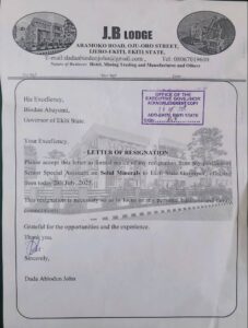 When the endorsement merchants thought they could project to the world an image of unanimity and undiluted consensus of Ekiti people over the adoption of Governor Oyebanji as sole gubernatorial candidate of the All Progressives Congress in next year’s election, Mr. Dada Abiodun John resigned his appointment as Senior Special Assistant on Solid Minerals.