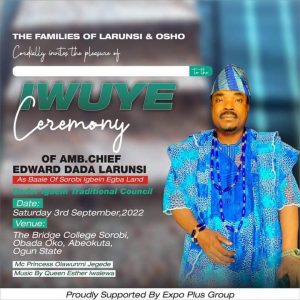 Asiwaju Unity Forum has congratulated Amb. Chief Edward Larunsi on his new position as the Baale of Sorobi Igbein, Egba Land.