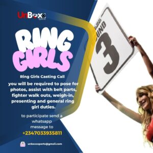The submission deadline for Ring Card Girl applications is Tuesday, May 21, 2024. To apply, please submit a full length photo, a headshot, and basic details about you (name, Age, height, weight) to unboxxsports@gmail.com or WhatsApp: +2347033935811.