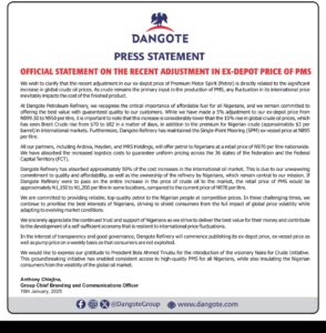 We wish to clarify that the recent adjustment in our ex-depot price of Premium Motor Spirit (Petrol) is directly related to the significant increase in global crude oil prices. As crude remains the primary input in the production of PMS, any fluctuation in its international price inevitably impacts the cost of the finished product.