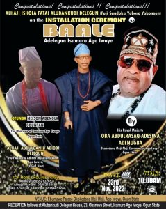 We also gathered that 23rd November, 2023 has been picked for the coronation ceremony of high chief Alhaji Ishola Fatai Alubankudi Delegun.