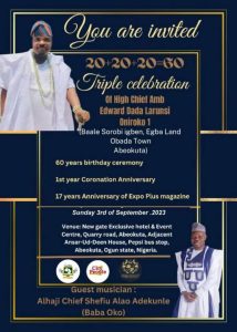 The whole town of Sorobi Igbein Egba land, Ogun state, is going to be set agog from 31st August to September 3rd, 2023, as the baale of the ancient community, Ambassador High Chief Edward Dada Larunsi is staging 3 in 1 event.