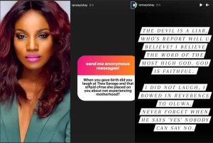 The anonymous fan asked: “When you gave birth, did you laugh at Tiwa Savage and that stupid curse she placed on you about not experiencing motherhood?”