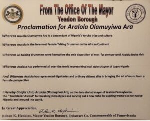 The multiple talents drummer cum singer was honoured as trailblazer by the mayor of Yeadon Borough De laware Commonwealth of Pennsylvania, his excellence Rohan K.Hepkins.