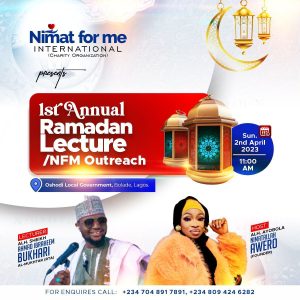 In her quest to bring succour to the less previledge people in the society, A non-governmental and non-profit making organisation ‘NIMAT FOR ME INTERNATIONAL CHARITY ORGANIZATIONS is holding a give away and first annual ramadan lecture.