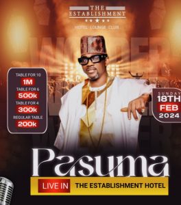 Pasuma Live at The Establishment Hotel is not just a concert; it’s an experience that brings together music enthusiasts, socialites, and fans for a night of celebration. With an array of table options catering to different preferences, attendees can choose the perfect setting to enjoy the rhythm and beats of Pasuma’s live performance.