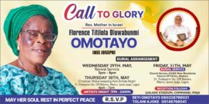 The passing of a beloved figure is never easy, but it is often marked by a celebration of their life and legacy. Such is the case with the upcoming burial arrangements for Rev. Mother in Israel Florence Titilola Oluwabunmi Omotayo, formerly known as Florence Titilola Oluwabunmi Omotayo (Nee Joseph). As friends, family, and well-wishers come together to honor her memory, a series of events have been organized to commemorate her life.
