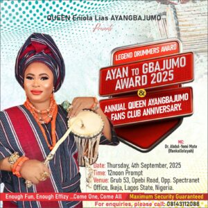 For Queen Ayangbajumo, drumming is more than music — it is heritage, history, and identity. Through her artistry and initiatives like the Ayan-to-Gbajumo Legends Award, she is ensuring that the timeless rhythms of Yoruba culture are celebrated, preserved, and passed down to future generations.