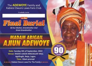 Lagos would be set agog on Sunday 4th September, 2022, as veteran and popular television and radio broadcaster, High Chief Abdulkabir Adeyinka Adewoye famously known as Kabiyeesi Owuro la wa is holding final burial ceremony for his late mummy, Madam Abigail Ajiun Adewoye Popularly known as Iya Esie.