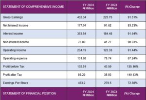 The bank recorded improved year on year performance as Gross Earnings grew by 92% to ₦432.34bn (FY 2023: ₦225.75bn). Interest Income was up 92% y/y to ₦353.54bn (FY 2023: ₦184.48bn). Also, Non-Interest Income was up 91% y/y to ₦78.80bn (FY 2023: ₦41.27bn).