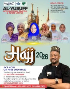 The travel and tour operator emphasized that early compliance will help pilgrims secure better arrangements in areas such as flight schedules, accommodation in Makkah and Madinah, and other essential services. He also assured that Al-Yusuff International Travel and Tours remains committed to guiding pilgrims through the registration, payment, and travel process.