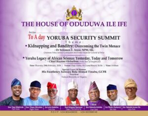 The Yoruba Security Summit holding on Thursday 29th February will bring together Oodua traditional rulers from Southwest region and from parts of Kogi Kwara states of Nigeria. Other participants are expected to be from a diverse array of stakeholders, including security experts, civil societies, labour union representatives, political leaders, religious leaders, captains of industries, youths, students’ organizations, and Yoruba Self-Determination groups. This inclusive approach aims to facilitate a comprehensive and collaborative strategy to address the multifaceted security challenges facing the Yoruba people.
